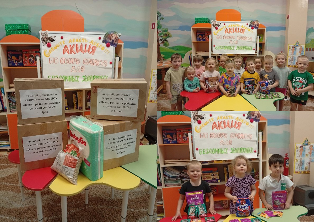 С целью воспитания гуманного отношения к бездомным животным, желания участвовать в благотворительных акциях в МБ ДОУ «ЦРР – детский сад № 29» г. Орла прошла ежегодная акция «Спешим делать добро» по сбору гуманитарной помощи.