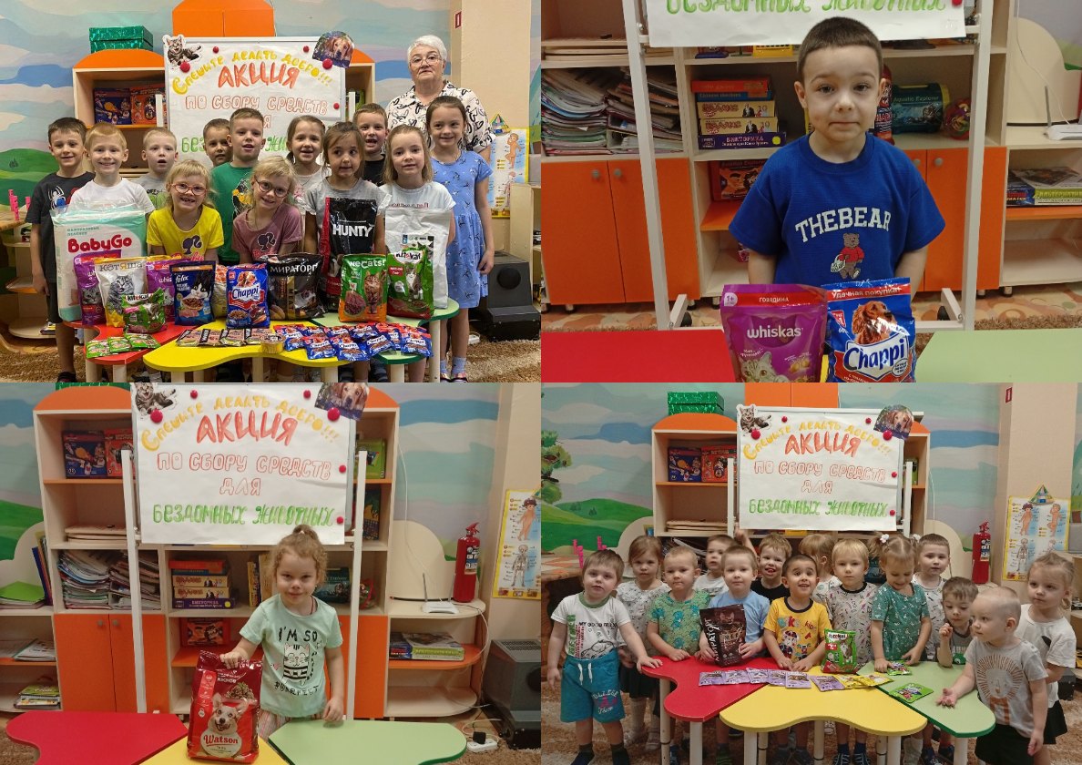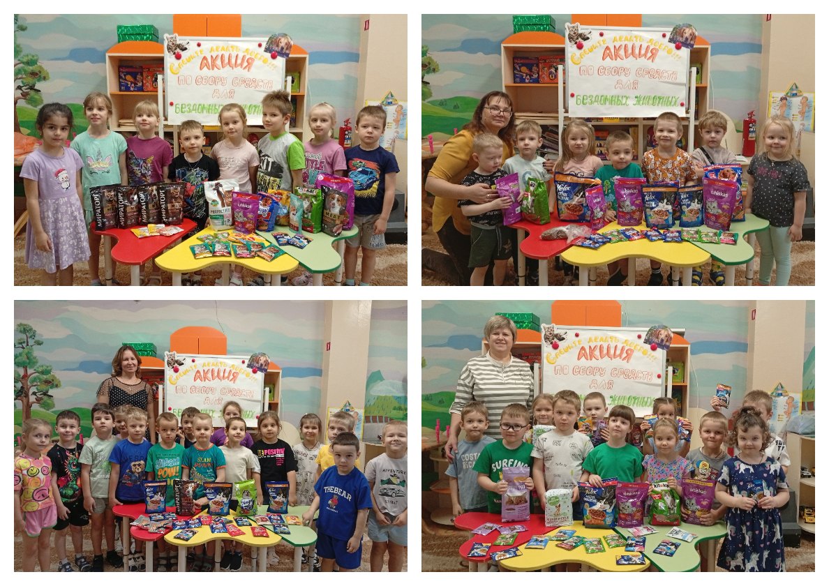 Силами детей, родителей, сотрудников были собраны корма, пелёнки и переданы ОРОО «Помощь животным «Кот и Пёс».