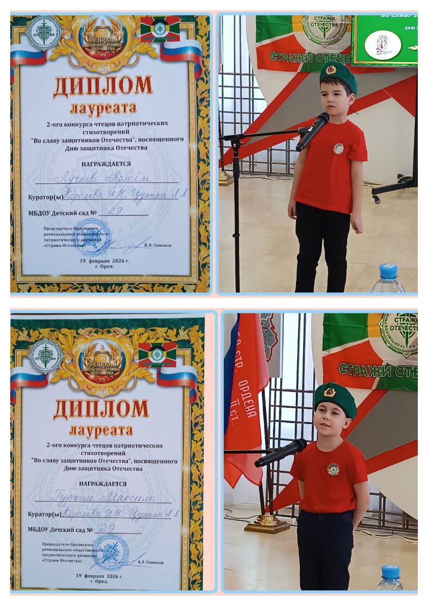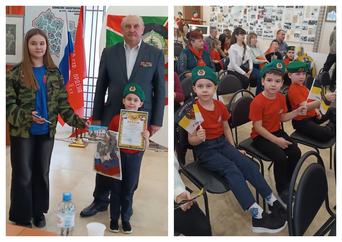 Наши воспитанники отряда «Юные друзья Стражи Отечества» Лучков Артём и Гуркин Максим под руководством наставников Цуниной Л. Л. и Королевой И. Н. стали лауреатами во втором конкурсе чтецов патриотических стихотворений «Во славу защитников Отечества», который прошёл в Орловском военно-историческом музее.